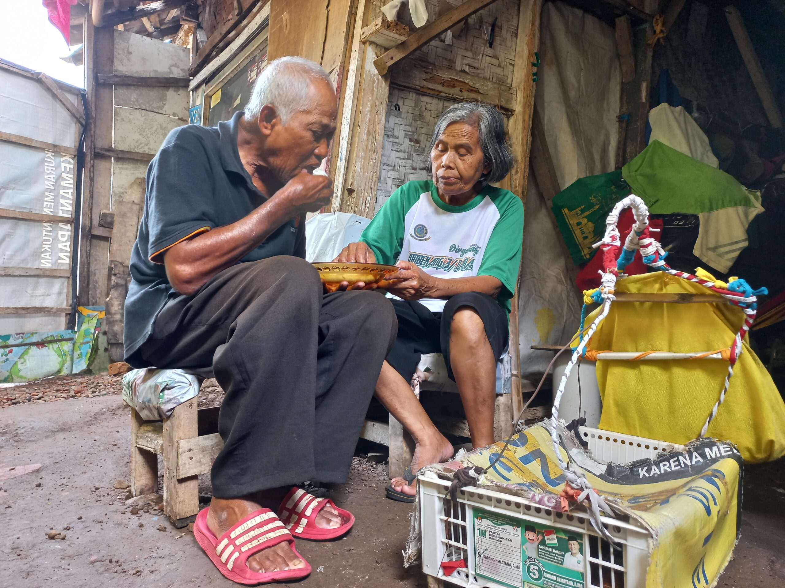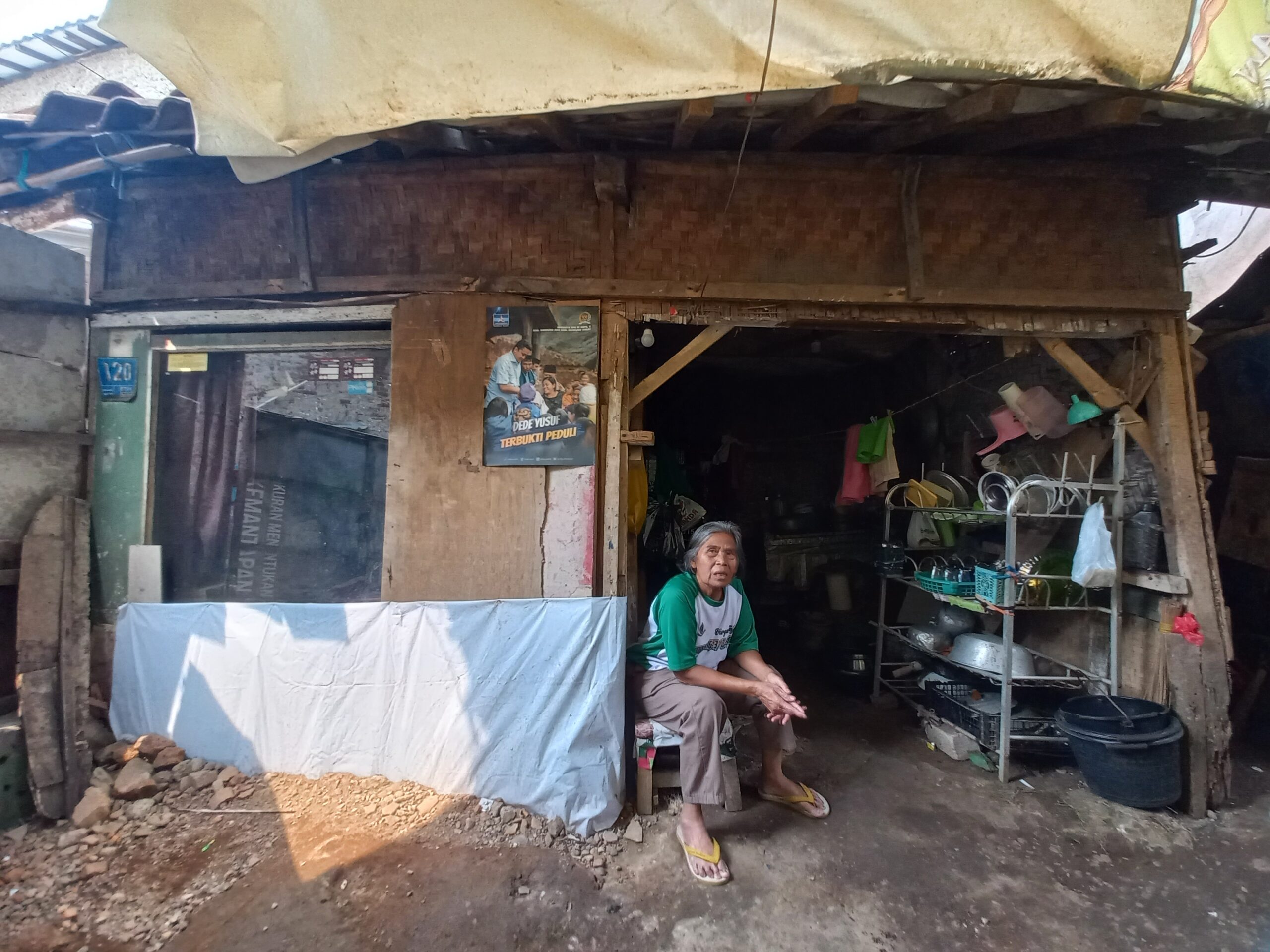Bersama sang istri, ia tinggal di sebuah gubuk reyot berukuran 3×4 meter, dengan dinding penuh celah, atap yang bocor parah, dan lantai tanah yang dingin. Setiap hari istrinya hanya bisa duduk di depan rumah, khawatir bangunan rapuh itu roboh kapan saja.