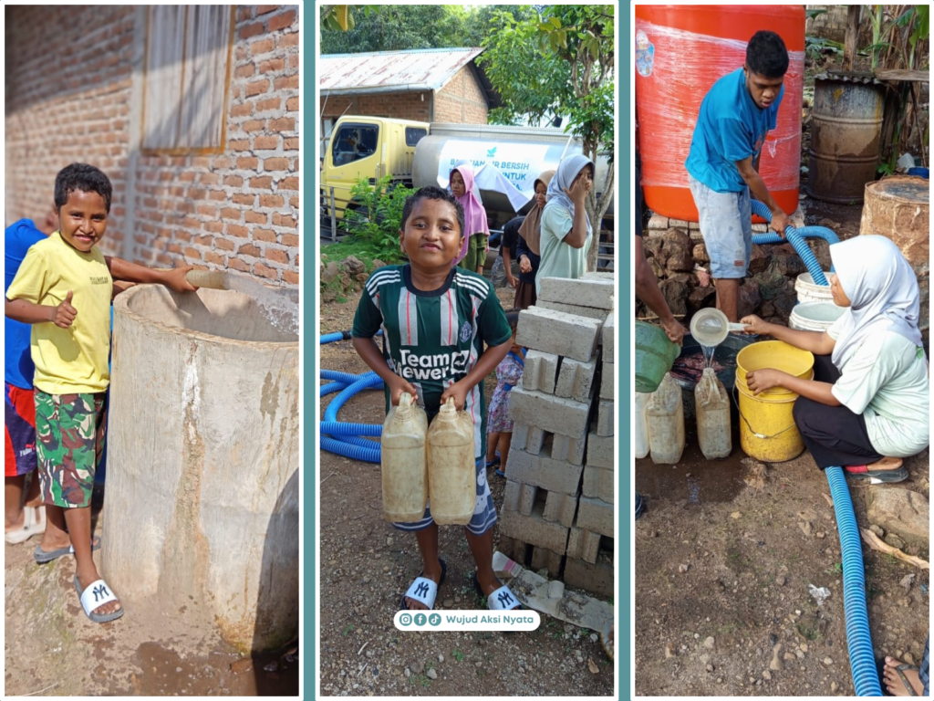 Sesampainya di lokasi, pemandangan penuh haru menyambut kedatangan relawan. Warga telah berkumpul sambil membawa jerigen, ember, dan wadah seadanya. Anak-anak yang biasanya harus berjalan jauh untuk mencari air, tampak sangat bersemangat. Ibu-ibu tersenyum lega, sementara para bapak saling membantu memastikan semua wadah terisi penuh.